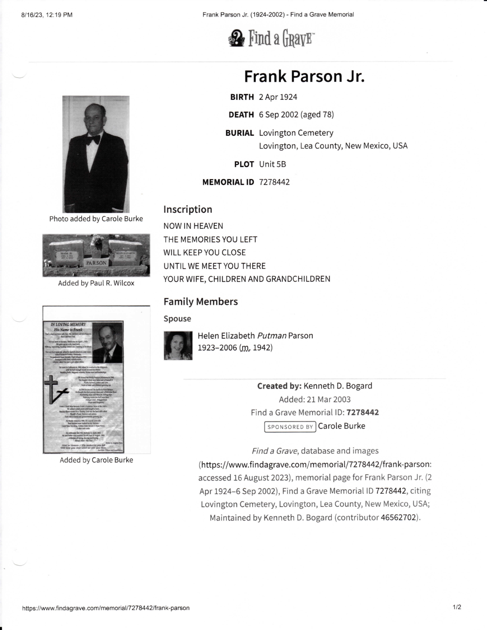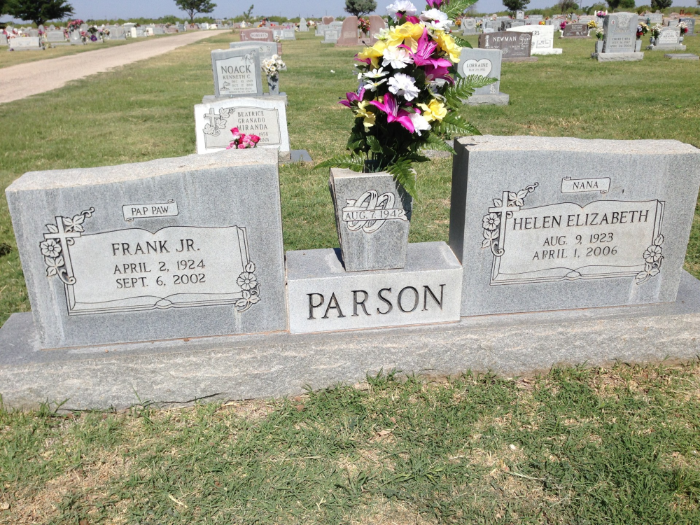 Robert Franklin Parson Jr. And Helen Elizabeth Putman Parson Your Grandfather, Robert Franklin Parson Jr. (Frank Jr.) was born in Yarnaby, Bryan Co., Oklahoma on April 2, 1924. His parents were Robert Franklin Parson (1902-1967) and Doris Oleta Llewallen Parson (1904-1990). They had farmed in Bryan Co., Oklahoma since their marriage in 1920. Frank had one older sister, Thelma, who was born in 1922, and one younger brother, Joe Douglas who was born in 1927. His father’s niece, Rose Marie DeLoach, who was born in 1932 also became a part of the Parson family in 1937, after her mother, Frank’s younger sister, Ora Della, died in Phoenix, Arizona. Your Grandmother, Helen Elizabeth Putman Parson was born in Kemp, Oklahoma on August 9, 1924. Her parents were Henry Clay Putman (1900-1987) and Etta Mae Thornton Putman (1903-1979). They were both born in Arkansas and were living in Kemp Township, Oklahoma by 1910. Helen grew up in a family of ten children, one of whom, (Ruby), died in infancy in 1930. Her oldest brother, Hugh Wilson, was born in 1921 when her parents were ages twenty and seventeen. Helen, the second oldest child was born in 1924 and three more brothers and four more sisters were soon to follow; Clarence (Shorty), in 1925; Ruth Ann, in 1927; Dora Faye, in 1930; Oleta, in 1932; Thelma Kay in 1936; Donald Ray, in 1937; and Henry Clay Jr. in 1940 when Clay and Etta were thirty-six and thirty-nine respectively. Both Frank Jr. and Helen grew up in Bryan Co., Oklahoma. Frank would grow up on his father’s farm and developed a deep love for the land. Helen’s early life was much more difficult. Her father worked as a farm laborer at times and often as a hired laborer at whatever he could find. Both Frank and Helen developed an incredible work ethic which they would maintain throughout their lifetime. By the 1930’s, the depression had begun and this generation would be the most deeply affected of all. They would grow up hungrier, stronger, and more determined than any other generation thus far; hungry, not only for food, but for stability and success. And they would soon become known as “The Greatest Generation.” Frank Jr. and Helen were both of school age by 1930. Frank Jr. would spend his school years in Yarnaby, an unincorporated community twelve miles east of Achille and Helen would spend her school years in Yuba, also an unincorporated community in Bryan Co., Oklahoma and also twelve miles east of Achille. As the crow flies, the two communities were located just three miles from each other, so it is likely that Frank Jr. and Helen knew each other all of their lives. By the 1930’s, every state required an elementary school education (grades 1-8) for all students, and as the decade progressed, many schools began to offer grades 1-12. In Yuba, a K-12 school was established in 1929. Rural school schedules were still often determined by planting, cultivating, and harvesting schedules. The schools offered a rigorous curriculum of reading, writing, arithmetic, and home-economics. On the 1930 census, both Frank and Helen are living in Kemp, Bryan Co., Oklahoma. Frank Jr. is six years old and living with his parents, Robert Frank and Doris, ages twenty-seven and twenty-five and his sister, Thelma, age seven, and his brother Joe, age two. Helen, age seven, is living in Albany, Oklahoma with her parents Henry Clay, age thirty and Etta, age twenty-six. Also listed are Hugh, age nine, Clarence (Shorty), age five, Ruth Ann, age three, and Ruby, age 0. This is a child that did not survive infancy. In the early1930’s, probably 1932 or 1933, Helen’s mother, Etta Mae, would be terribly burned in a kerosene explosion, while cooking. While attempting to pull her out of the fire, Clay’s hands received severe burns, leaving him incapacitated for many months. Etta Mae was burned so severely that the country doctor, (Doc Bolinger), moved in with them and stayed for several months, and it took several years for Etta to heal. She had to learn again how to talk, walk, and use her hands, feet, arms and legs.. It took a miracle for her to survive. But she did. What an incredibly strong woman she was! At this time Hugh would have been eleven or twelve; Helen, nine or ten; Shorty, seven or eight; Ruth Ann, five or six; Dora Faye, two or three; and Oleta, just an infant. With her brothers Hugh and Shorty’s help, they were able to pull this family out of this crisis. They nursed both their mother and their father back to health, raised the younger children, planted and harvested the garden, fed the chickens, did all of the cooking and washing, and somehow Helen still became a serious student. This experience certainly left scars, leaving Helen completely resistant to ever talking about her childhood. And Frank talked, and talked and talked about his. These were their school years, and both she and Frank were excellent students. As the end of the 1930’s approached, the world was again being drawn into global conflict. By 1937, Japan was in an undeclared war with China and by 1938, Germany had annexed Austria with no interference from either Britain or France. In 1939, Germany invaded Poland and the world was outraged. World War II had begun. This was a time when Frank Jr. and Helen were in High school where each of them would graduate as Valedictorians of their class and then go on to Southeastern Teacher’s College in Durant for one semester. They were each the first members of their families to do so. The 1940 census shows the Parson family still living on the same farm in Bryan County. Robert Frank and Doris are ages thirty-seven and thirty-five. Three children are still living in the home; Frank Jr., age fifteen; Joe, age twelve; and Rose Marie, age eight. In 1940, Clay and Etta, ages forty and thirty-seven, are living in Kemp Township (E of Range Line between Ranges 9 and 10 in Townships 8 and 9). Helen, age sixteen; Clarence (Shorty), age fourteen; Dora Faye, age ten; Oleta, age eight; Ka