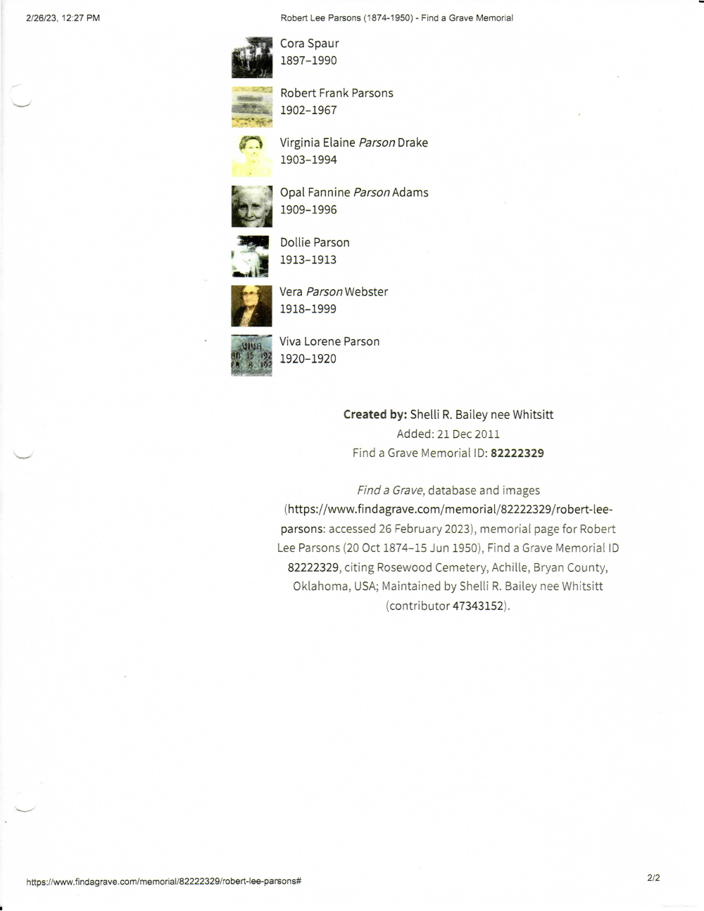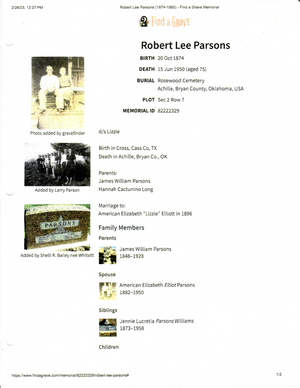 Extraordinary!Lula Jane: Born 1898. Died 1970. Age 72. Eula Mae: Born 1900. Died 1985. Age 85. Robert Frank: Born 1902. Died 1967. Age 65. Virginia Elaine (Lena): Born 1903, died 1994. Age 91. John Lee: Born 1906. Died 1981. Age 75. Ora Della: Born 1907. Died 1937. Age 30. Fannie Opal: Born 1908. Died 1996. Age 87. Clara Belle: Born 1911.Died sometime after 1990. Dolly: Born 1913. Died 1913. Harvey Eugene: Born 1914. Died 1982. Age 68. Vera: Born 1918. Died 1999. Age 81. Viva Lorene: Born 1920. Died 1920. The 1898 Land Rush proved to be the opportunity that the newly married couple had been dreaming of and they packed up their belongings and moved from Texas to Oklahoma where they would remain for many years. The beginning years of Bob and Lizzy’s marriage also coincided with the beginning of a new century; one which would bring more changes to their America than any other generation had ever witnessed. In 1900, Bob, age twenty-six, and Lizzy, age eighteen were the parents of three young children; Cora, age three, Lula, age two, and Eula, an infant. They were most likely living in the area of McKinney, Texas in Collin, Co. Much was changing in their America. In 1901, President McKinley was assassinated and Theodore Roosevelt became the twenty-sixth President of the United States. In 1903, the Wright Brothers had made their first flight at Kitty Hawk, and by 1907, Oklahoma had become a state and the Model T was traveling down the backroads of America. BY 1910, Bob, age thirty-six and Lizzy, age twenty-eight had eight children and were living in Kemp, Bryan Co., Oklahoma. Cora was thirteen, Lula was twelve, Eula was ten, Frank was eight, Lena was seven, John was four, Ora was three, and Opal was two. The early settlers to this region, had been coming to the area since the 1880’s and had greatly increased after the Oklahoma Land Rush of 1889. Oklahoma had now been a state for three years. Located in Bryan Co., Kemp, now known as Hendrix, is located less than one mile from the Red River. This area was originally known as Warner Springs because of the spring water it provided to the early settlers. Most of these early settlers belonged to the Chickasaw tribe. Between1908 and 1910, the Missouri, Oklahoma and Gulf railway had built tracks through the area on the way south to Texas, bypassing, by several miles, the town of Kemp. For the first half of the twentieth century the town had two names, Hendrix (it’s postal designation) and Kemp City. In 1911, the community had a telephone exchange, a sawmill, three merchants, a saloon, a barber, a livery stable, a contractor, and a real estate office. North of town, the Bloomfield Indian School and Seminary still operated. The town was a trade center for fifteen to seventeen square miles of prime agricultural land that produced large crops of cotton and corn. The economy was based primarily on agriculture. In 1916, a tornado destroyed most of the town, including the bank, and killed many residents. Although some businesses did not rebuild, many did. By 1920, the population stood at one hundred thirty and had a telephone company, three general stores, two grocers, three physicians, a drugstore, an undertaker, a blacksmith, a cotton gin, and a hotel. The gathering storm was beginning to brew in Europe and Bob and Lizzy’s America was about to change once again. In 1914, World War | began and by 1917 the United States had entered the fray. This war began when Austrian Archduke Ferdinand was assassinated by a Serbian rebel and The Austrian- Hungarian Empire declared war on Serbia. This war was fought primarily over territory after Germany’s rise to power after the Franco-Prussian War of 1817. The Allied Powers; Great Britain, France, Italy, Romania, Japan, and eventually the United States fought against the Central Powers; Germany, Austria-Hungary, Bulgaria, and the Ottoman Empire. Tensions had been brewing throughout Europe after Germany’s reunification and annexation of French territories, thus upsetting the European balance of power. This led to alliances throughout the world who became involved because of Great Britain’s wide reaching colonization and dominance throughout the world. World War I involved over thirty countries and over a period of four years left fifteen million people dead. It is not known how this “war to end all wars” affected the Parsons family, but it certainly must have had great impact on their lives. Between 1917 and 1918 Robert Lee had signed up for the World War I Draft. According to his Draft Card, he was a self-employed farmer living in Hendrix, Bryan Co., Oklahoma. He was forty-three years old, 5ft. 4 in., 131 Ibs., with blue eyes. At this time, he had a wife and ten children, with all, but perhaps the oldest three, living at home. He and Lizzy were also expecting another child at this time. Not unexpectedly, he was not called to serve. The United States did not enter the war until 1917 after the German submarines torpedoed the “Lusitania,” killing one hundred twenty-eight American passengers and over a thousand from other countries. Only then, did President Woodrow Wilson declare war. The war brought the new horrors of modern military technology, combat in the skies, chemical warfare, and the devastating effects of trench warfare. The war ended at 11:00 on November 11, 1918 with allied victory, seven and a half months after the United States had entered the war. Our brave men, those who survived, returned home gassed, shell-shocked, with frozen feet having been rotted in the trenches, and devastating battle injuries. We honor them each year on Veteran’s Day. The United States had sustained more than 320,000 casualties in the First World War, including over 53,000 killed in action and 204,000 wounded. There were also over 63,000 non-combat related deaths, mainly due to the Spanish Flu Epidemic of 1918. From Oklahoma, 90,527 served, 1,064 died, 4,154 were wounded, and 502 were listed as missing in actio